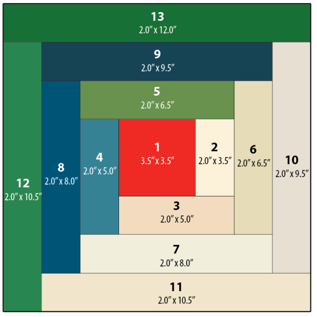 So instead, I started to think more about quilts and ways narrative could lend itself to some traditional layouts. I played with the idea of making a large log cabin quilt. Log cabin patterns create a sort of spiral, they are built starting with the center with pieces added to the outside. This is a pattern I’ve used in knitting and sewing before, but not in data physicalizations.